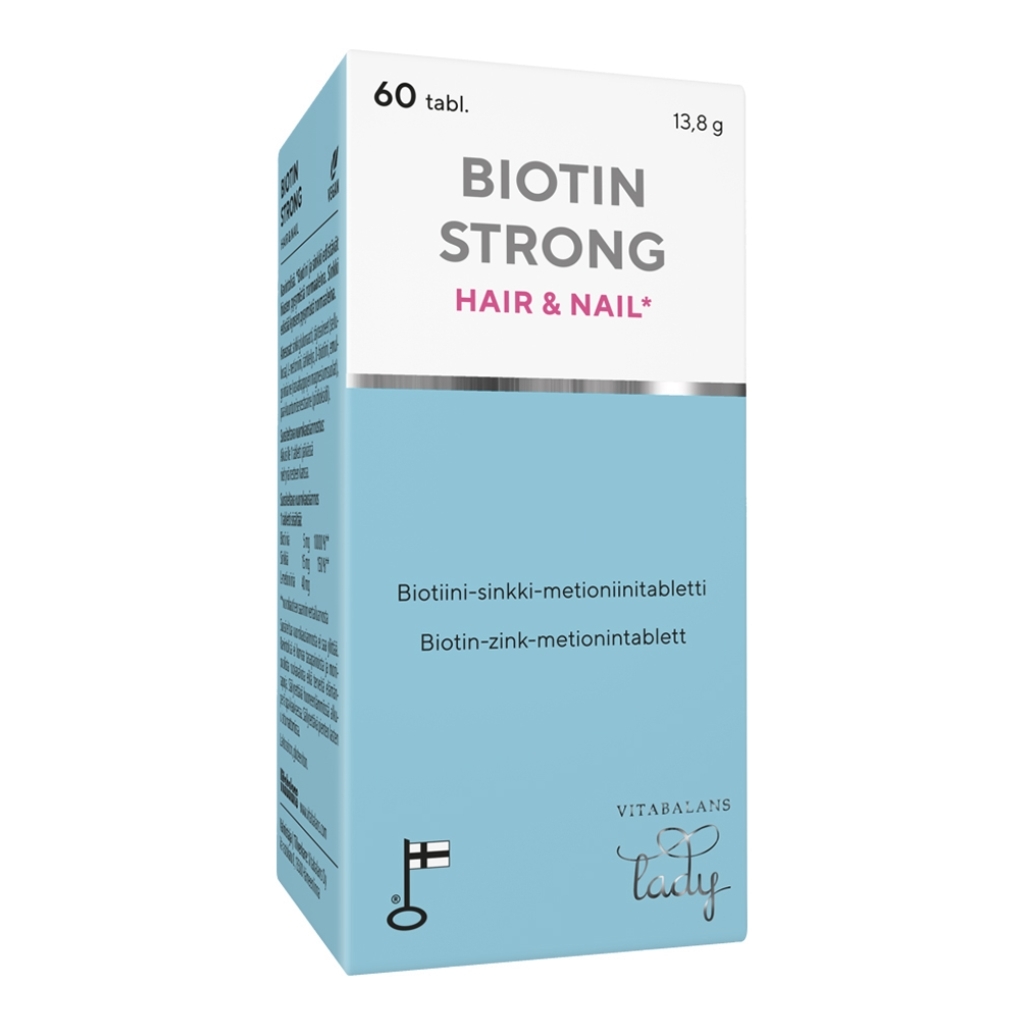 Biotin Strong Hair & Nail on ravintolisä, joka on kehitetty tukemaan hiusten ja kynsien normaalia kuntoa. Hiukset ja kynnet koostuvat keratiinista, jonka muodostumiseen tarvitaan useita ravintoaineita. Valmiste yhdistää biotiinin, sinkin ja rikkiä sisältävän metioniini-aminohapon tasapainoiseksi kokonaisuudeksi osaksi päivittäistä hyvinvointia.