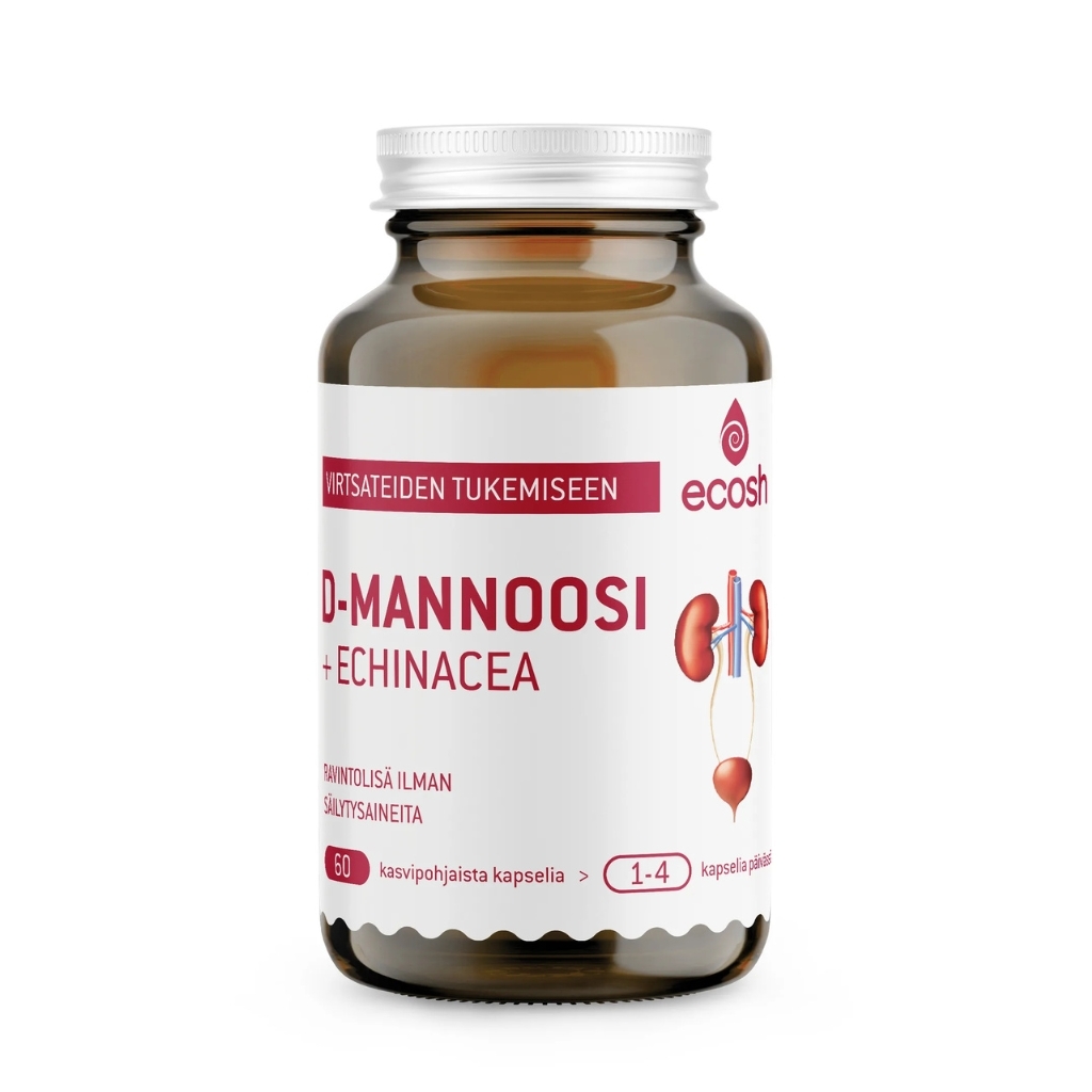 Ecosh D-MANNOOSI + Echinacea on luonnollinen yhdistelmä, joka tukee virtsateiden ja virtsarakon terveyttä sekä elimistön omaa puolustuskykyä. D-mannoosi on luonnollinen sokeri, joka auttaa puhdistamaan virtsateitä, ja auringonhattu (Echinacea purpurea) vahvistaa vastustuskykyä ja edistää virtsateiden hyvinvointia.