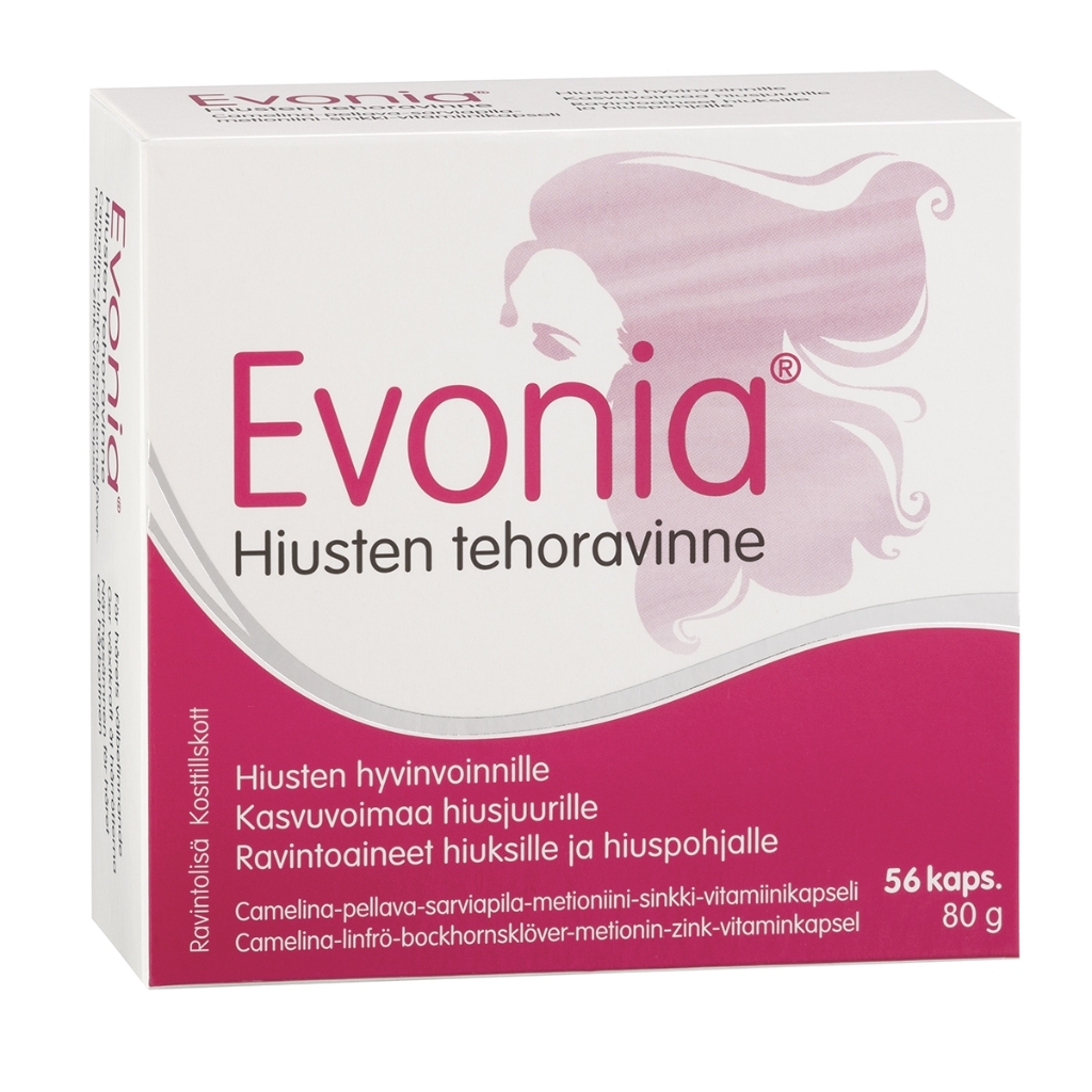 Evonia® Hiusten Tehoravinne on huolellisesti koostettu ravintolisä hiusten ja päänahan hyvinvoinnin tueksi. Valmiste on kehitetty yhteistyössä HiusAkatemian asiantuntijoiden kanssa ja sisältää 15 tarkoin valittua ravintoainetta, kuten kasviöljyjä, aminohappoja, vitamiineja ja hivenaineita. Yhdistelmä on suunniteltu täydentämään päivittäistä ravintoa erityisesti hiusten normaalin kasvun ja rakenteen näkökulmasta.