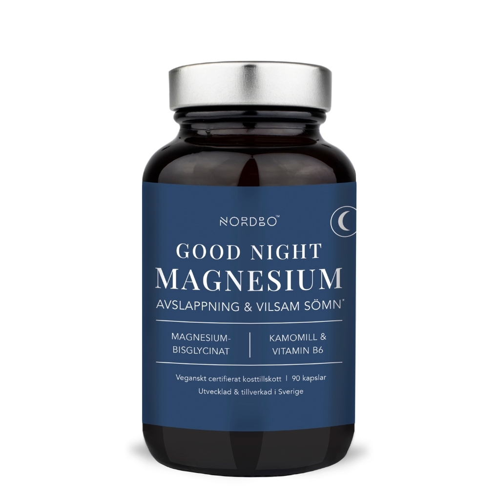Nordbo Good Night Magnesium on ravintolisä, joka on kehitetty tukemaan rentoutumista ja laadukasta unta. Valmiste yhdistää vatsaystävällisen magnesiumbisglysinaatin, rauhoittavan kamomillauutteen sekä aktiivisen B6-vitamiinin, jotka yhdessä tukevat kehon ja mielen rauhoittumista iltaa kohden.