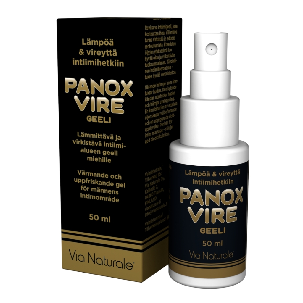 Panox Vire geeli on lämmittävä ja virkistävä intiimigeeli miehille, joka yhdistää 100 % luonnolliset raaka-aineet aistikkaaseen käyttökokemukseen. Geeli kosteuttaa ihoa, tukee hyvää pintaverenkiertoa ja sopii erinomaisesti intiimihierontaan tai virkistävään hetkeen kumppanin kanssa. Tuoksultaan raikas yhdistelmä eteerisiä öljyjä luo miellyttävää oloa ja rentoutumista.