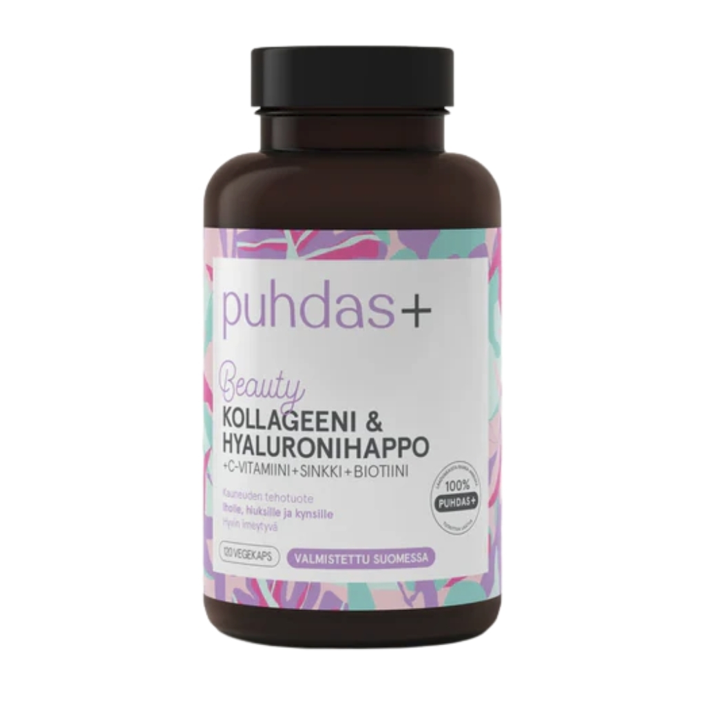 Puhdas+ Kollageeni & Hyaluronihappo on monipuolinen ravintolisä kauneuden tueksi sisältäpäin. Tuote yhdistää hydrolysoidun kalakollageenin, hyaluronihapon, C-vitamiinin, sinkin ja biotiinin. C-vitamiini edistää normaalia kollageenin muodostumista ihon normaalia toimintaa varten. Sinkki ja biotiini edistävät ihon pysymistä normaalina. Hyaluronihappo tunnetaan kyvystään sitoa vettä, mikä tukee ihon kosteustasapainoa.
