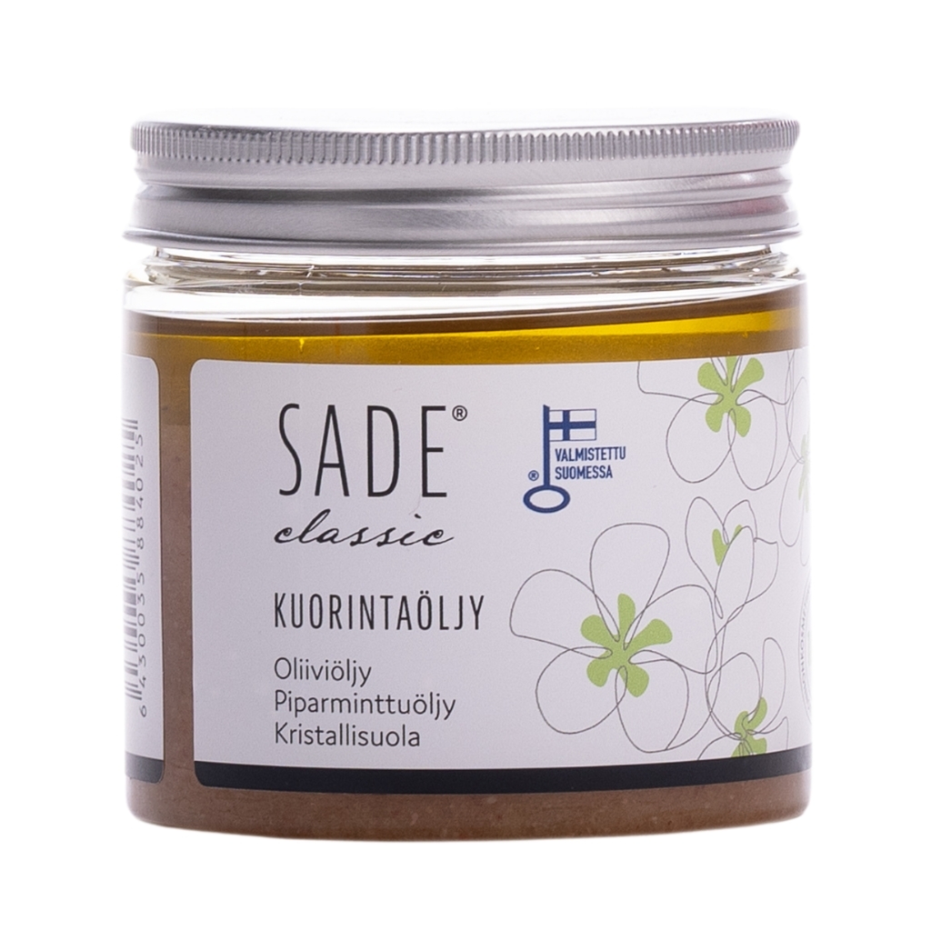 Sade oliiviöljy kristallisuola kuorintaöljy yhdistää Himalajan kristallisuolan kuorivan vaikutuksen sekä ravitsevan oliiviöljyn hoitavat ominaisuudet. Kuorinta poistaa kuollutta ihosolukkoa ja auttaa ihoa uusiutumaan, samalla kun kasviöljyt ravitsevat ja pehmentävät ihoa.
