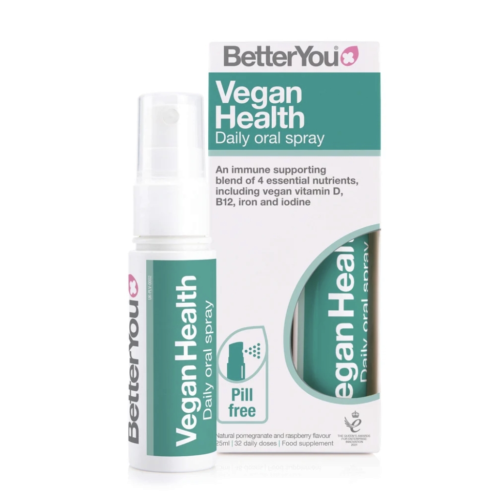 BetterYou Vegan Health Oral Spray on suun kautta annosteltava ravintolisä, joka on kehitetty täydentämään vegaanista ja kasvisruokavaliota. Spray-muotoinen annostelu tarjoaa helpon ja vaivattoman tavan saada useita keskeisiä ravintoaineita päivittäin. Ravintoaineet annostellaan suun limakalvolle, mikä tekee käytöstä miellyttävää ilman tabletteja tai kapseleita.